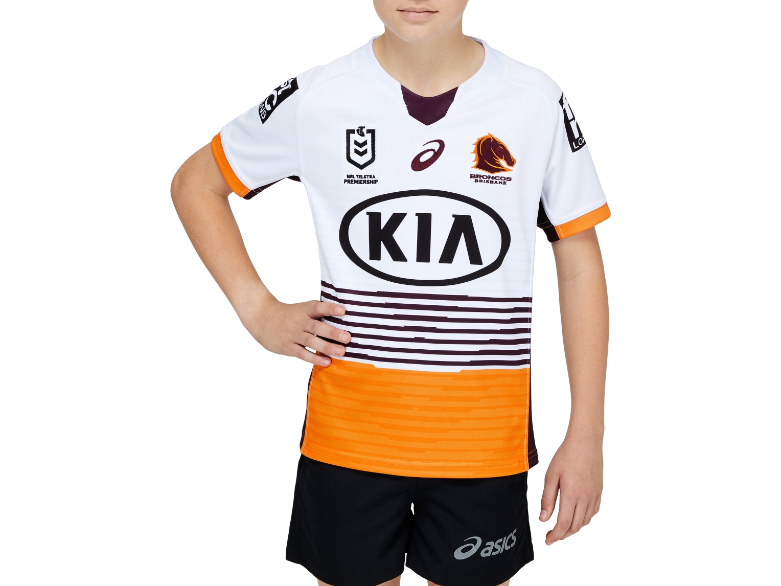 The BRISBANE BRONCOS REPLICA AWAY JERSEY YOUTH features a reversed white colourway with sublimated Broncos maroon and gold stripes and combined technological advancements in fabric, fit and durability.