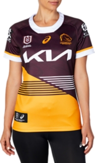 The BRISBANE BRONCOS REPLICA HOME JERSEY features the traditional Broncos maroon & gold colourway combined with a modern angled stripe design update for 2023. A new ergonomically designed neckline and body panelling update to provide added comfort. Produced using a durable lightweight polyester performance fabric.