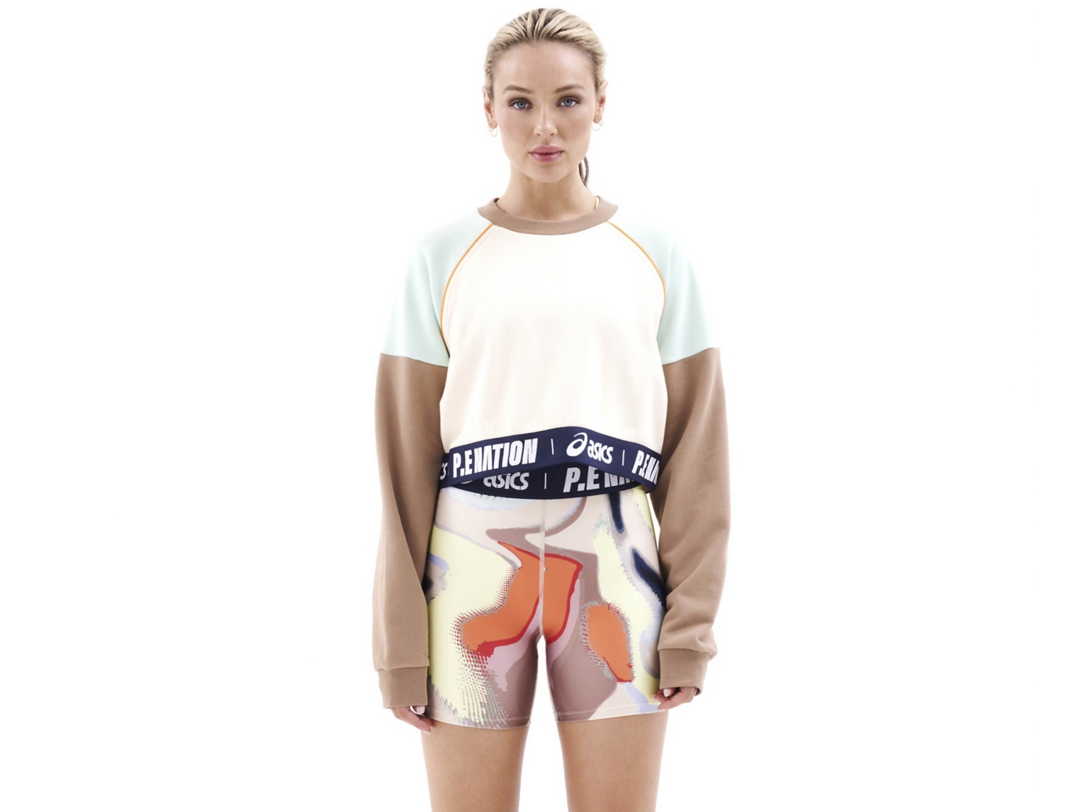 The signature P.E NATION colour block design detail is matched with a P.E NATION X ASICS branded hemband.