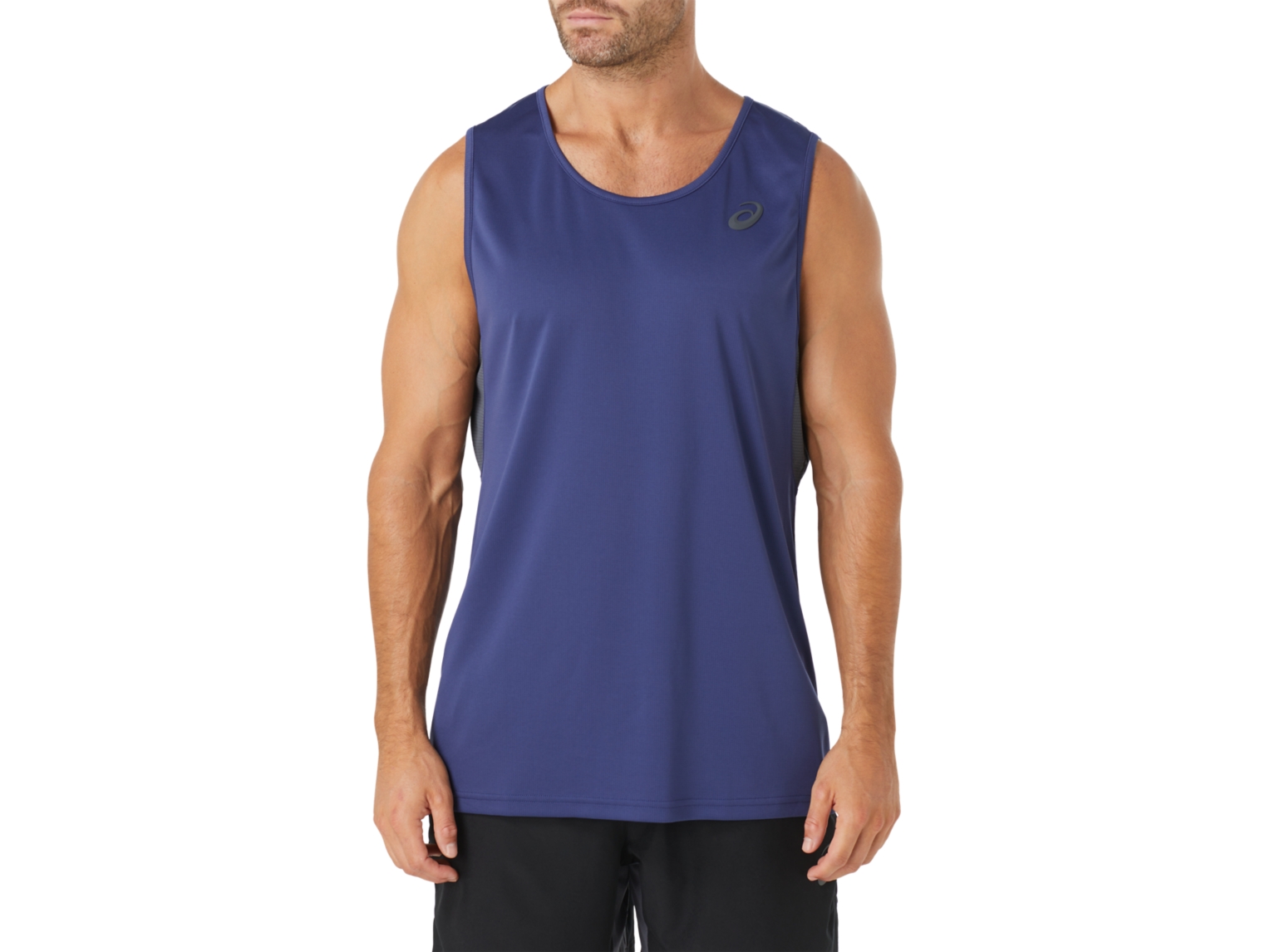 The PERFORMANCE SINGLET features a grid textured main body with breathable mesh inserts at the underarm, and a soft 3D bevelled edge ASICS spiral logo.