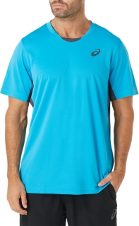 The PERFORMANCE TEE features a grid textured main body with breathable mesh inserts under the sleeves, self fabric binding at neckline and armholes, and a soft 3D bevelled edge ASICS spiral logo.