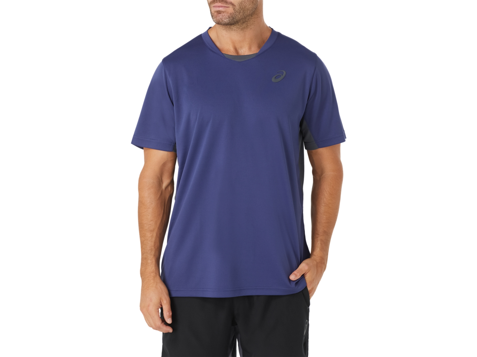 The PERFORMANCE TEE features a grid textured main body with breathable mesh inserts under the sleeves, self fabric binding at neckline and armholes, and a soft 3D bevelled edge ASICS spiral logo.