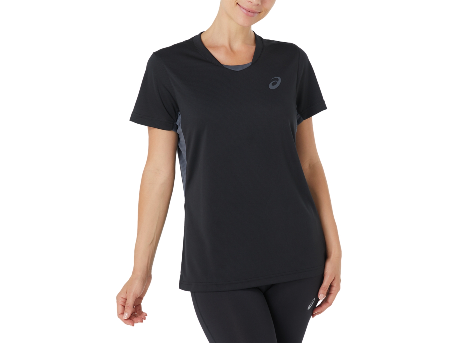 The PERFORMANCE TEE features a grid textured main body with breathable mesh inserts under the sleeves, self fabric binding at neckline and armholes, and a soft 3D bevelled edge ASICS spiral logo.
