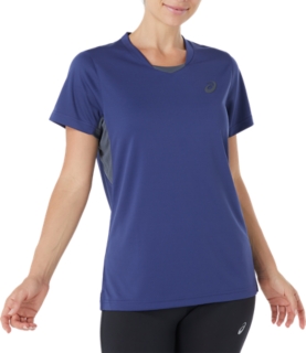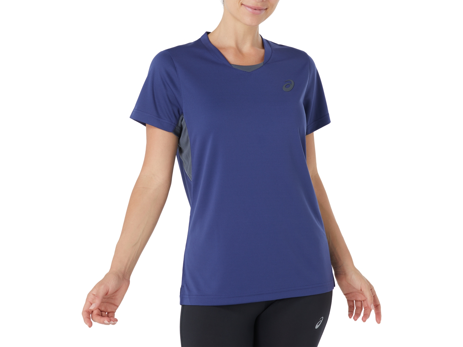 The PERFORMANCE TEE features a grid textured main body with breathable mesh inserts under the sleeves, self fabric binding at neckline and armholes, and a soft 3D bevelled edge ASICS spiral logo.