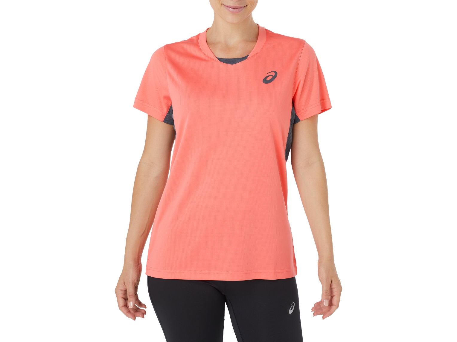The PERFORMANCE TEE features a grid textured main body with breathable mesh inserts under the sleeves, self fabric binding at neckline and armholes, and a soft 3D bevelled edge ASICS spiral logo.