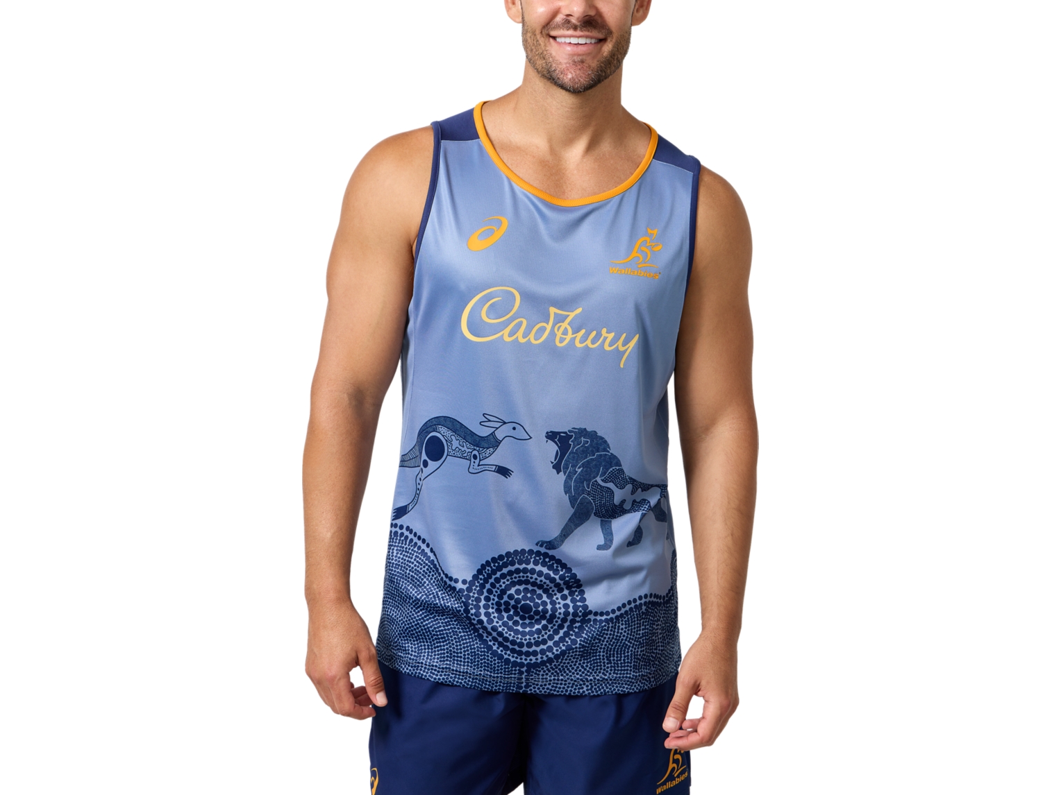 The WALLABIES TRAINING SINGLET presents a striking combination of rich base tones and sublimated Indigenous graphic print finished with Wallabies gold trim highlights creating a vibrant finished product.