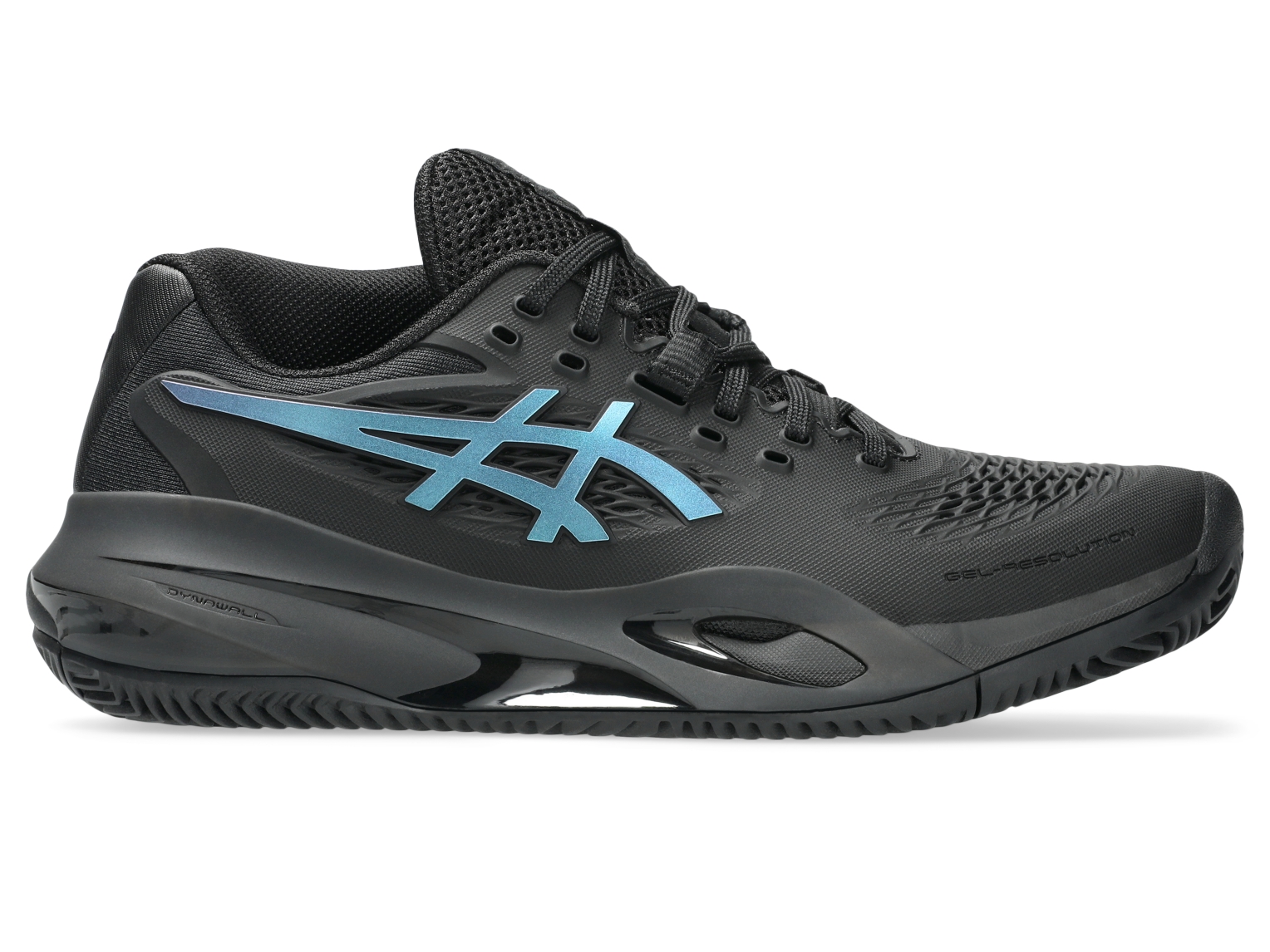 De GEL-RESOLUTION X CLAY NIGHT ENERGY-tennisschoen biedt geavanceerd comfort voor spelers die vanaf de baseline willen domineren. â De schoen is voornamelijk zwart, met prismablauwe contrasterende accenten.