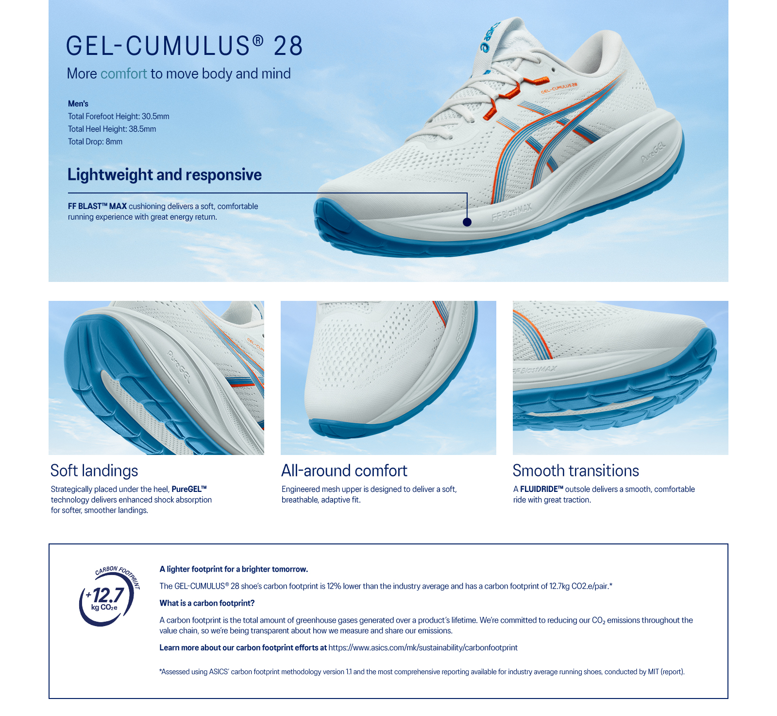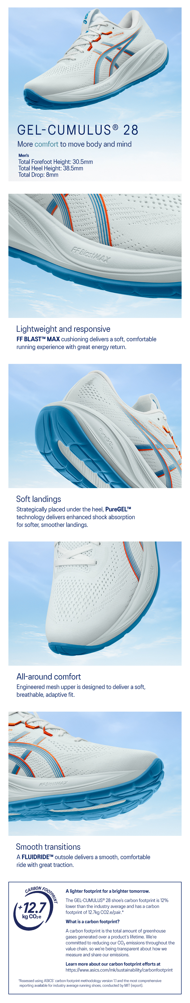 The GEL-CUMULUS® 28 shoe is a lightweight running shoe that's designed to provide a smooth underfoot experience.