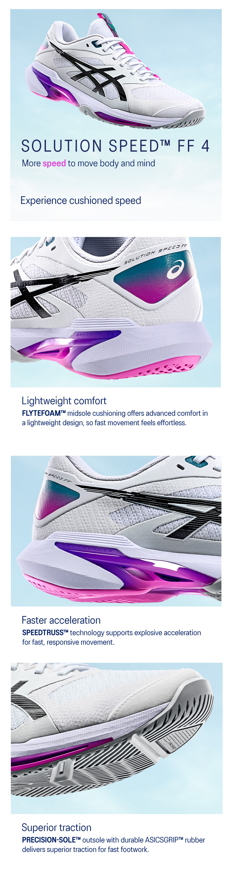 The SOLUTION SPEED™ FF 4 shoe is a fusion of speed and quickness. It's engineered to elevate your performance with advanced features focused on supporting fast and dynamic motions.