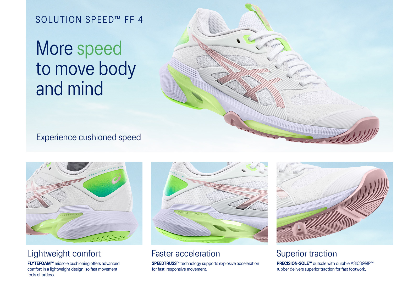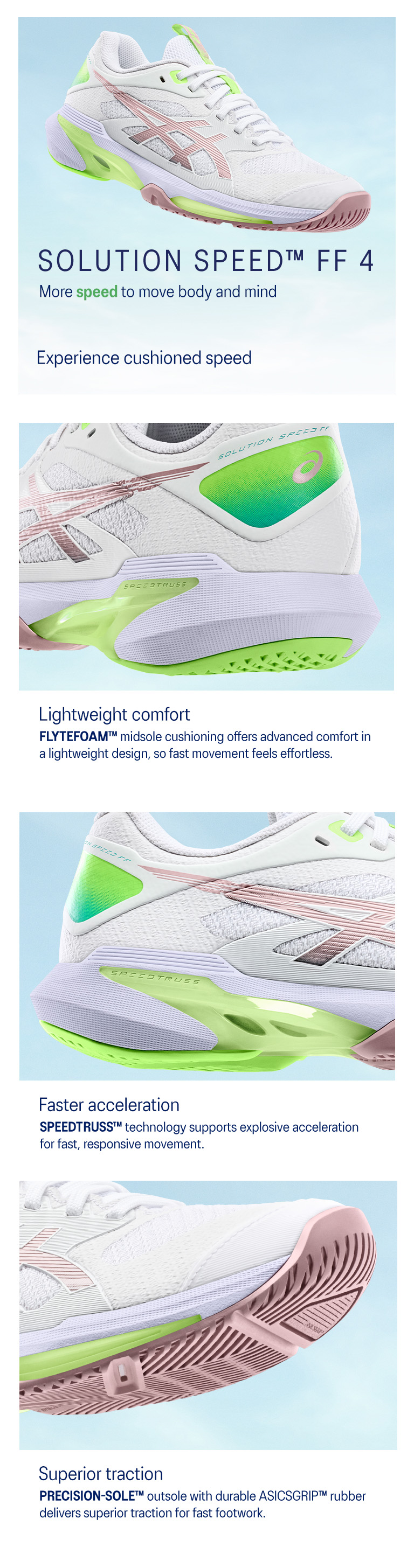 The SOLUTION SPEED™ FF 4 CLAY shoe is a fusion of speed and quickness. It's engineered to elevate your performance with advanced features focused on supporting fast and dynamic motions.