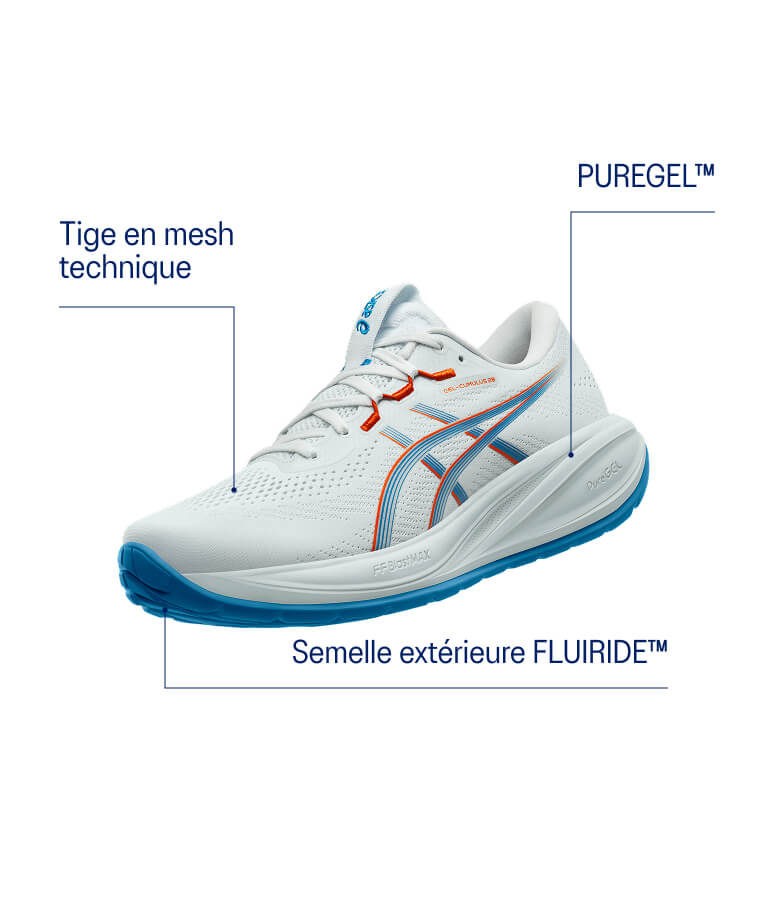 La GEL-CUMULUSâąÂ 28 est idĂ©ale pour courir tous les jours, grĂące Ă son confort et son maintien maximum sur tous les terrains. Plus lĂ©gĂšre qu'auparavant (6 g de moins), elle favorise une transition fluide Ă chaque foulĂ©e pendant un footing rapide ou sur une moyenne distance.