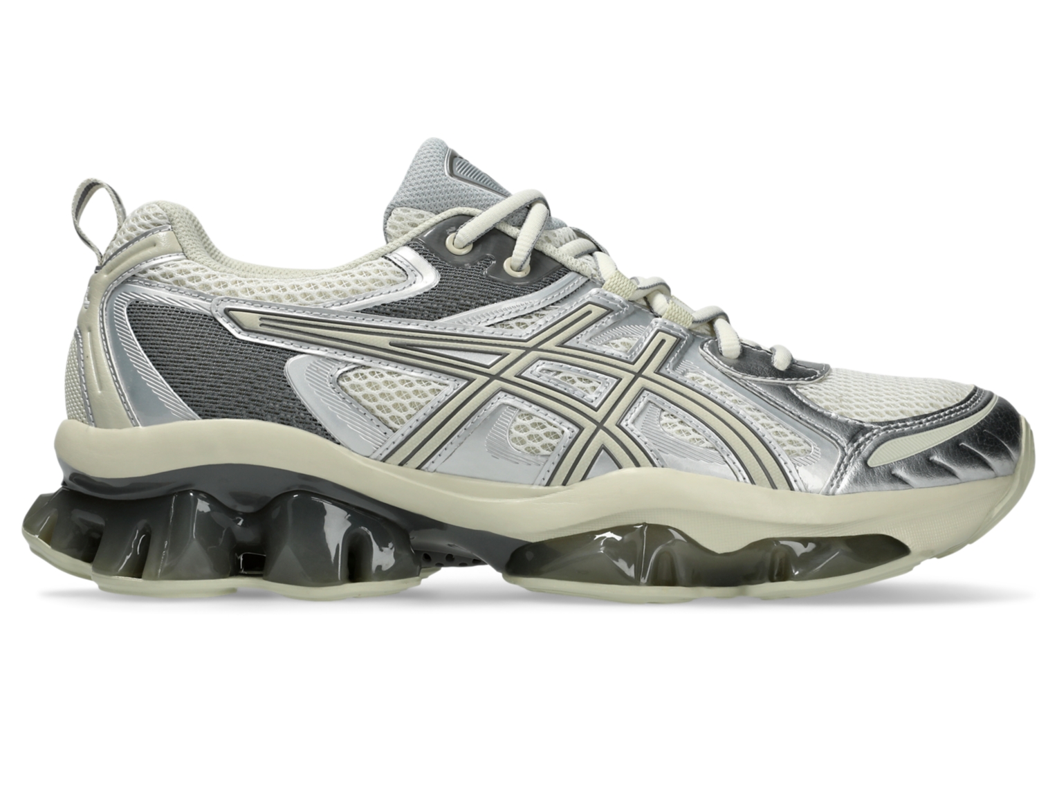 La parte superior está compuesta por pieles sintéticas y varios paneles de malla que aportan mayor comodidad. Su estética avanzada se inspira en las franquicias icónicas de carrera ASICS como las series GEL-NIMBUS, GEL-KUSHON, GEL-KINETIC y GEL-KINSEI.