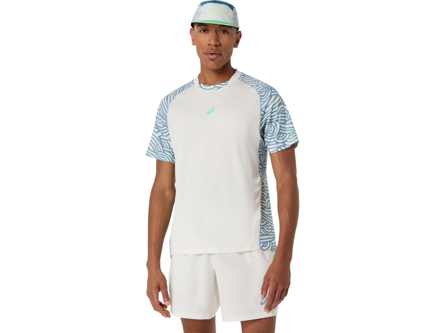 The top also features a graphic print that's inspired by Japanese stencil patterns and traditional cloud illustrations. This seasonal design motif symbolizes the idea of air circulation and its ability to provide breathability and comfort while moving.
