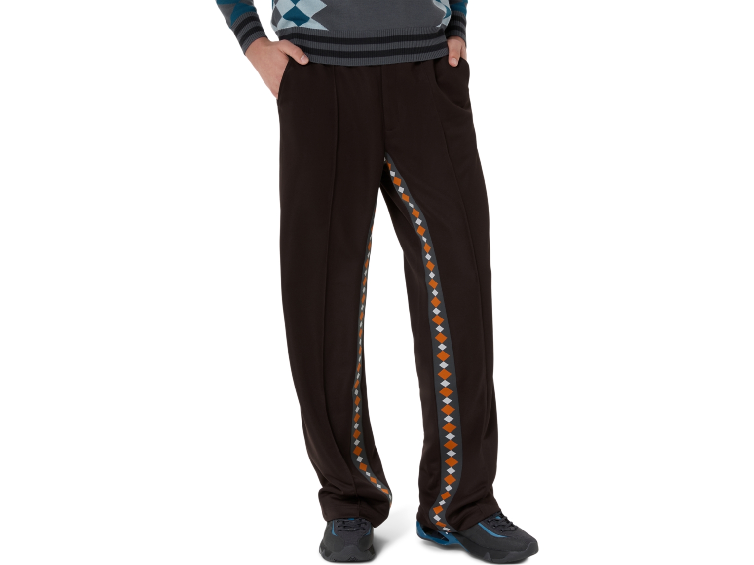 Created with a polyester fabric, these pants are an update from our season two collection, featuring an argyle tape on the inside of the legs. â
