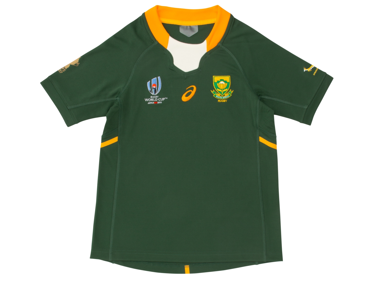 Kids can wear the Springbok colours with pride thanks to this South Africa children's replica short sleeve home shirt from ASICS.