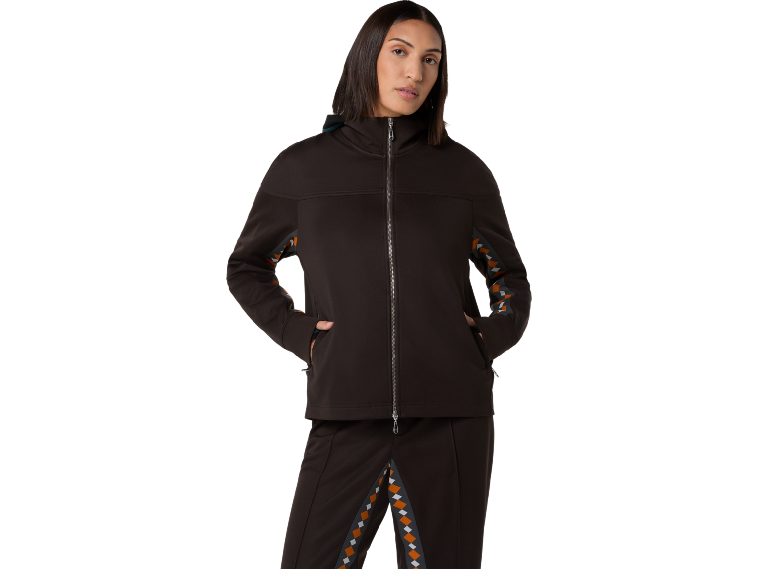 A abertura frontal com fecho de correr inclui uma marca de dupla face. Além disso, os punhos canelados são complementados com uma bainha reta e duas pinças nas costas.