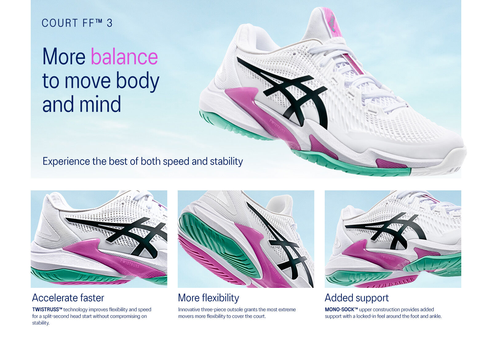 - Forefoot GEL™ technologyImproves impact absorption and creates a softer feeling at footstrike