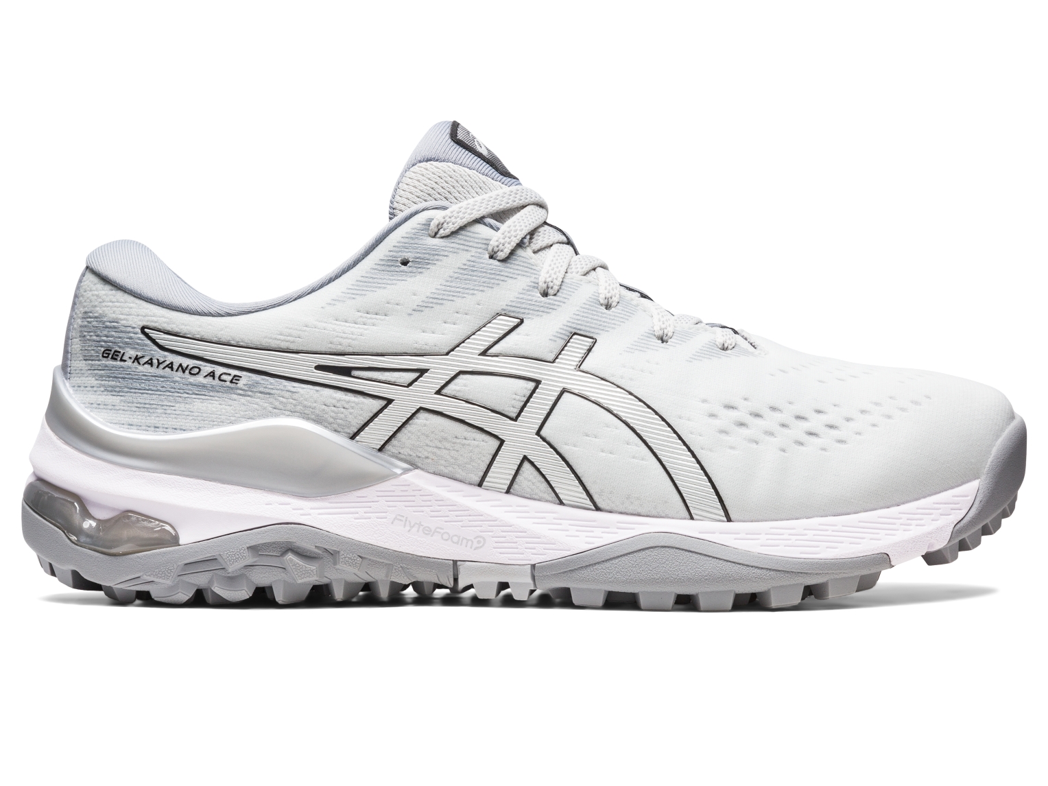 The GEL-KAYANOĀ® ACE golf shoe is inspired by our iconic stability running shoe. It's designed for the player who's seeking advanced support and traction to assist their swing. Similar to our running footwear, this shoe also features a TPU heel cradle that holds your foot in place. This component comfortably keeps your feet centered during your swing and when you're walking across the course. Meanwhile, the outsole is formed with a strategic traction pattern that improves your grip. It helps you remain locked-in during your shot throughout the course's varying topography.