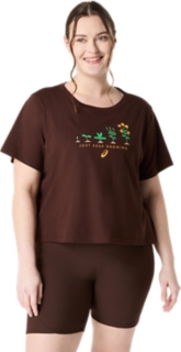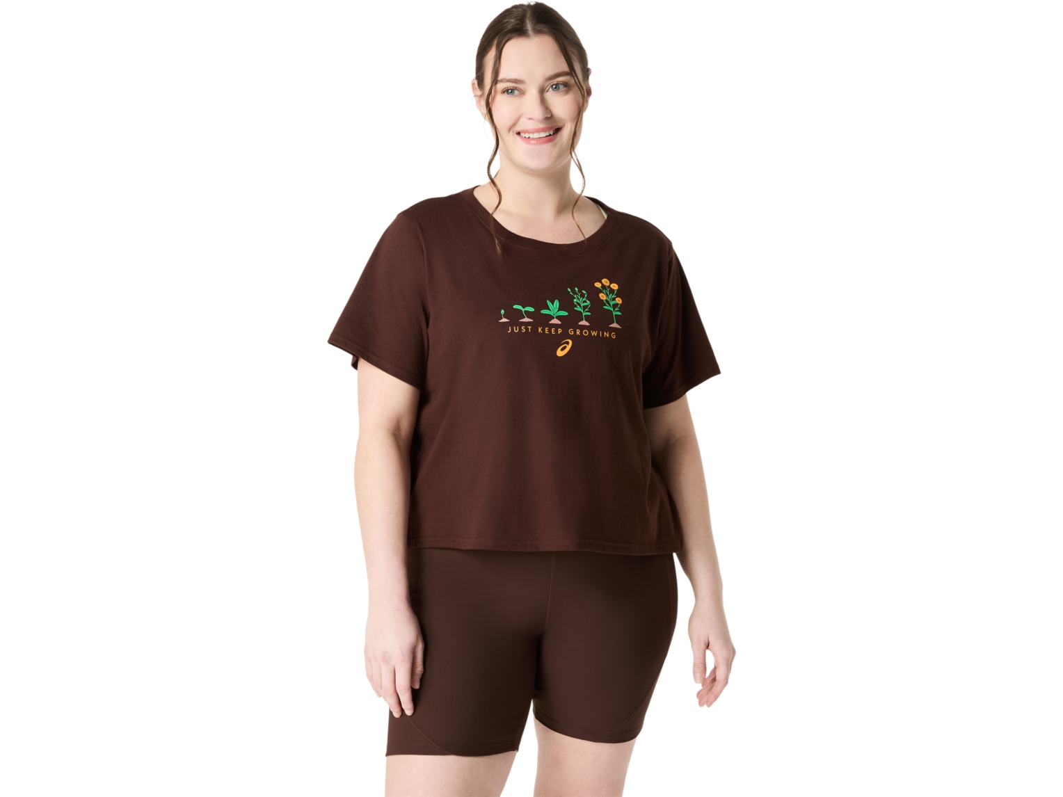 This comfortable knit short sleeve tee features a series of plant graphics at different stages of their growth cycle on the front. It also has the phrase, ""JUST KEEP GROWING"" written underneath.