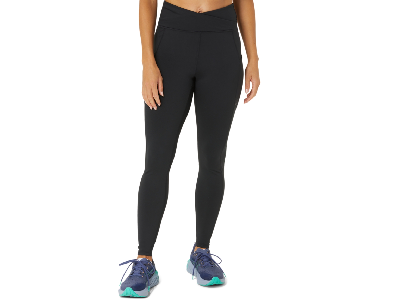 Features a high waist band and a kimono inspired cross fold for improved stability during your workouts.